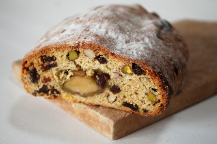 Ce doit être dans l’air du temps, les pistaches, parce qu’après t’avoir renvoyé ma proposition de stollen au levain (que je n’ai toujours pas essayée, pas eu le temps :-(), j’ai eu une envie aiguë de stollen aux pistaches et… aux cranberries.