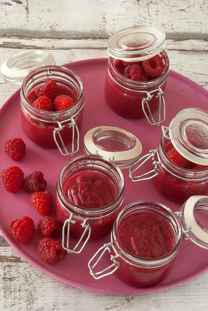 Placer les framboises surgelées dans une casserole et cuire sur feu doux jusqu’à ce qu’elles commencent légèrement à compoter. Passer au blender, puis filtrer pour écarter les pépins (on peut faire un très bon sirop de framboise avec ces derniers !).